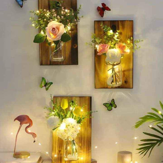 Led glass jar with flower arrangement in beautiful look wooden hanging.